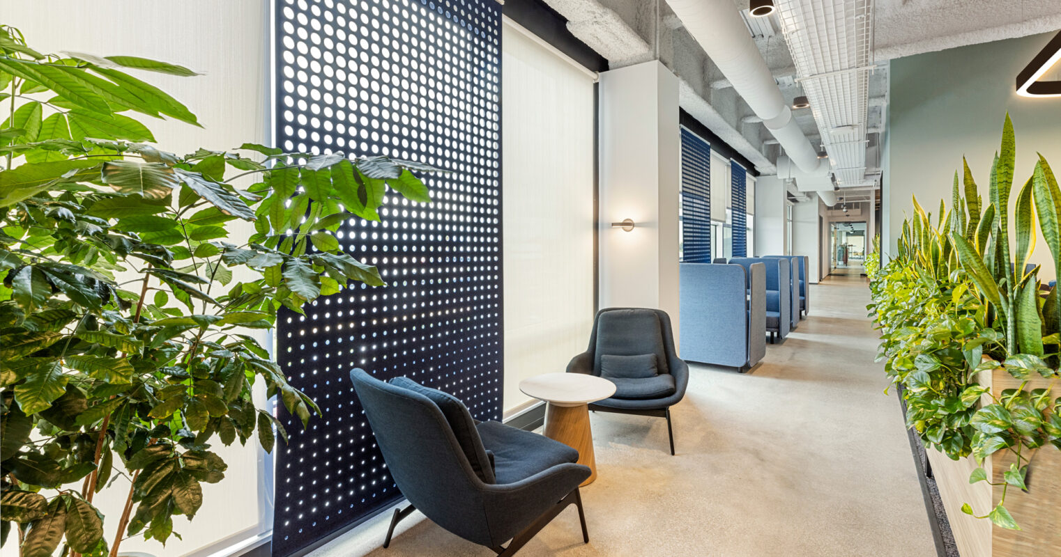 Strategic placement of workspaces on the interior enhances access to natural light.