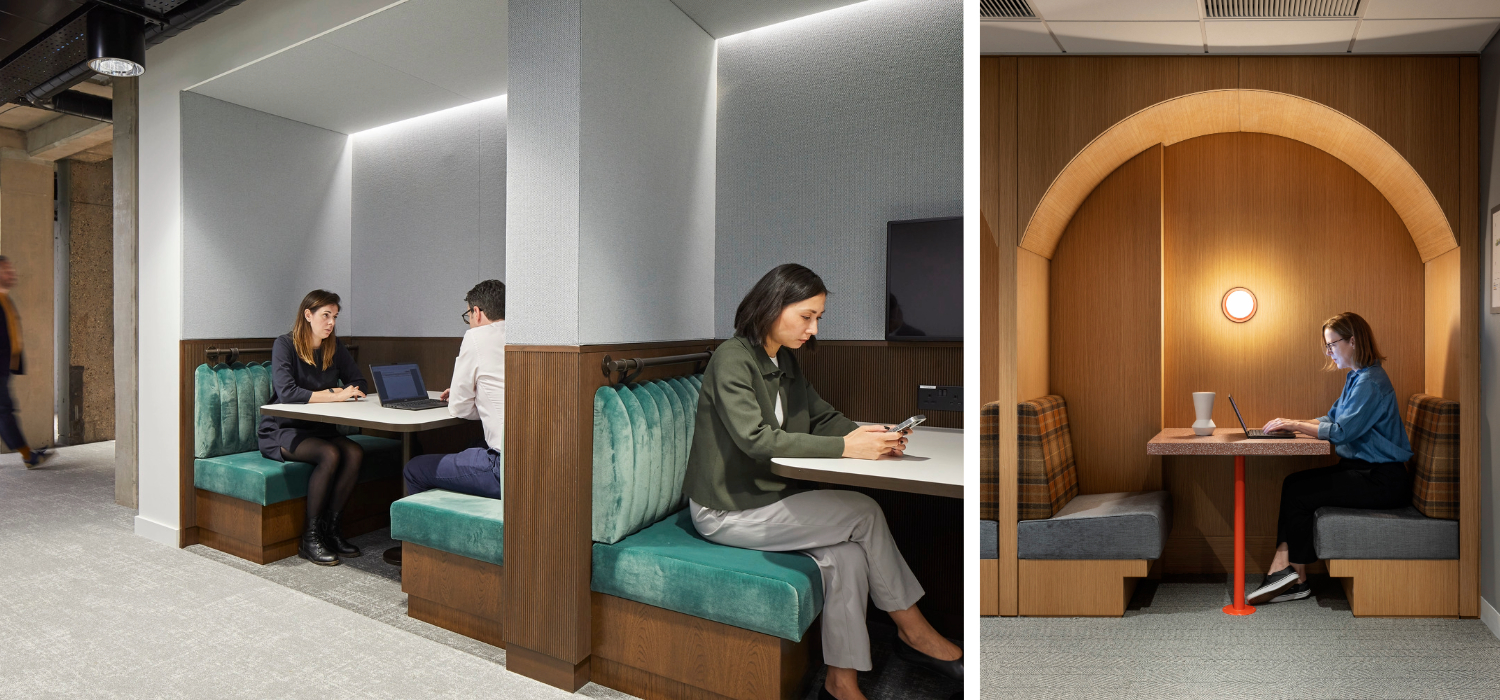 Consider two-person booths that allow for comfortable solo eating and working with visual and acoustic privacy, while still providing the ability to overhear conversations and join in, or have people stop by and say hello.